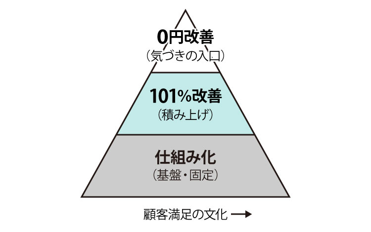 0円改善(気づき) → 101%改善(積み上げ) → 仕組み化(固定化)